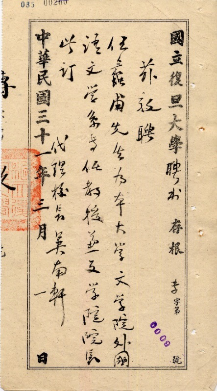 伍蠡甫教授担任出版研究委员会主任委员的聘书