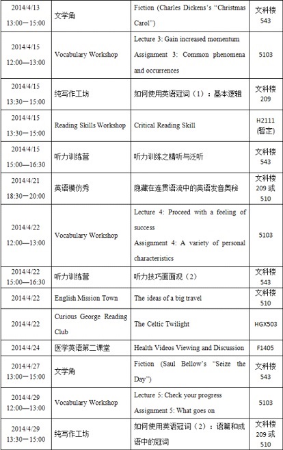 大学英语教学部第二课堂开课啦!4月份的活动安排里,有你感兴趣的么?