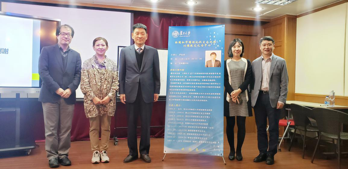 2019年11月11日,复旦大学外文学院韩文系主办的“韩国语的语系归属及其特点”及“韩国和中国的礼仪文化比较-以儒教文化为中心”讲座于文科楼209会议室举行。讲座分别由韩国首尔国立大学语言教育学院院长张素媛教授和国语国文系教授尹汝卓主讲。