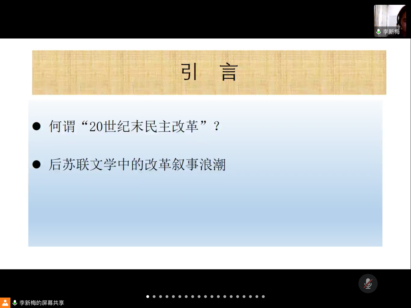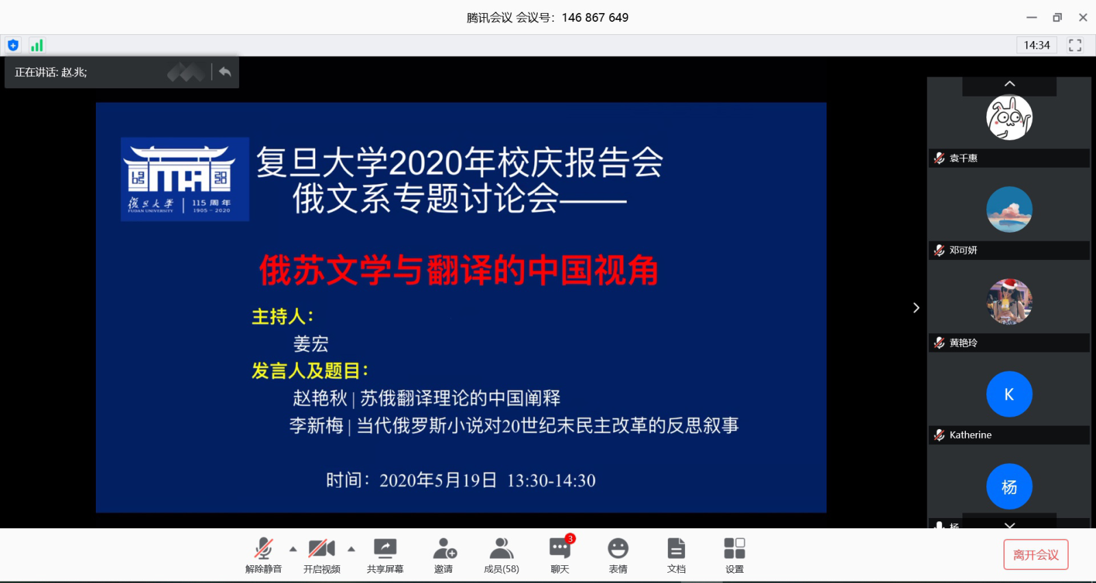 2020年5月19日,复旦大学外文学院俄文系2020年校庆学术报告会暨专题讨论会“俄苏文学与翻译的中国视角”成功在线举办。会议由俄文系主任姜宏教授主持,俄文系教师赵艳秋、李新梅分别进行报告。60多位师生参会。
