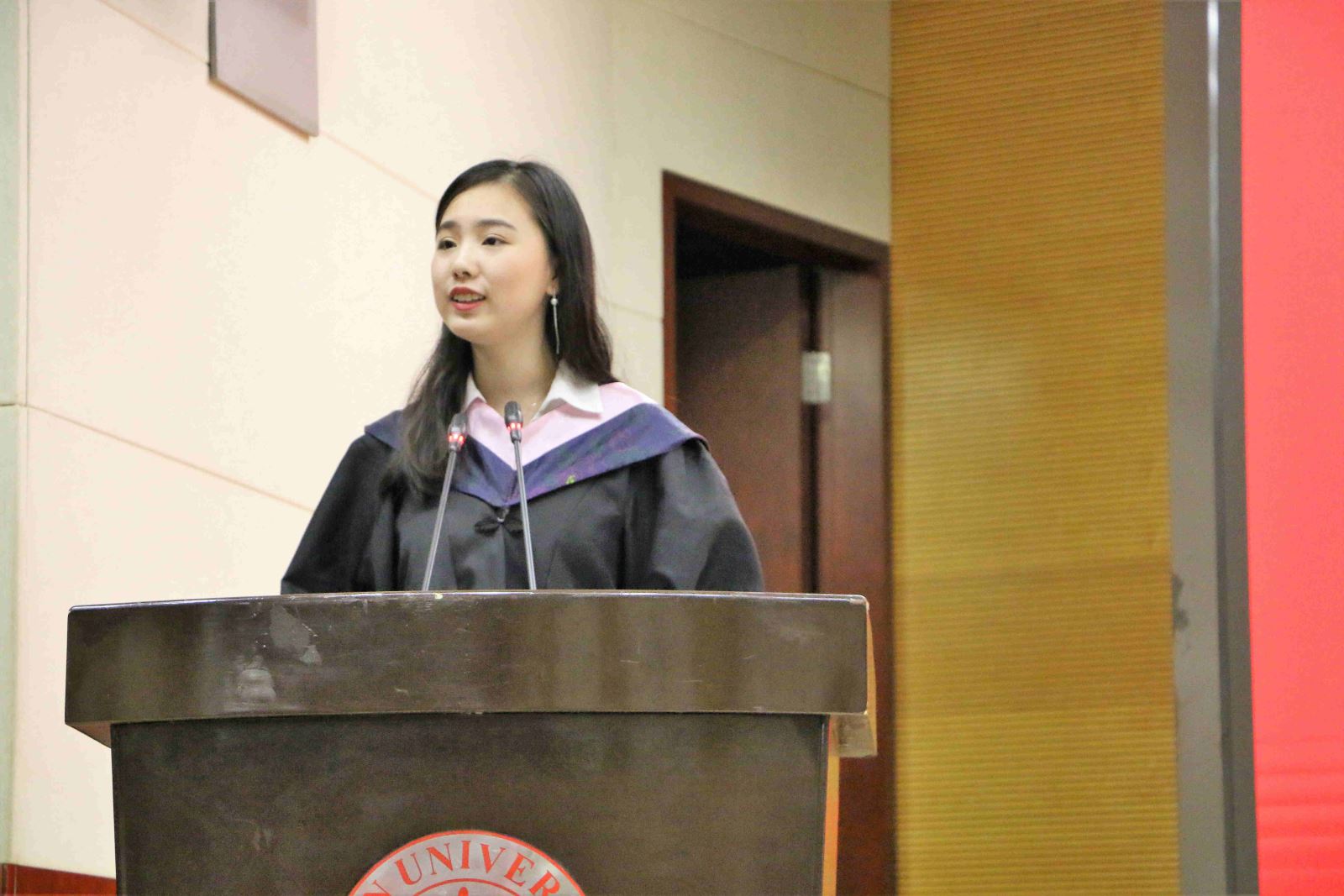 优秀本科毕业生代表、2018届翻译系本科生王子欣,优秀研究生毕业生代表、2018届英文系博士研究生缪蓬先后发言,表达了对学院和师长的感恩和对美好未来的憧憬。