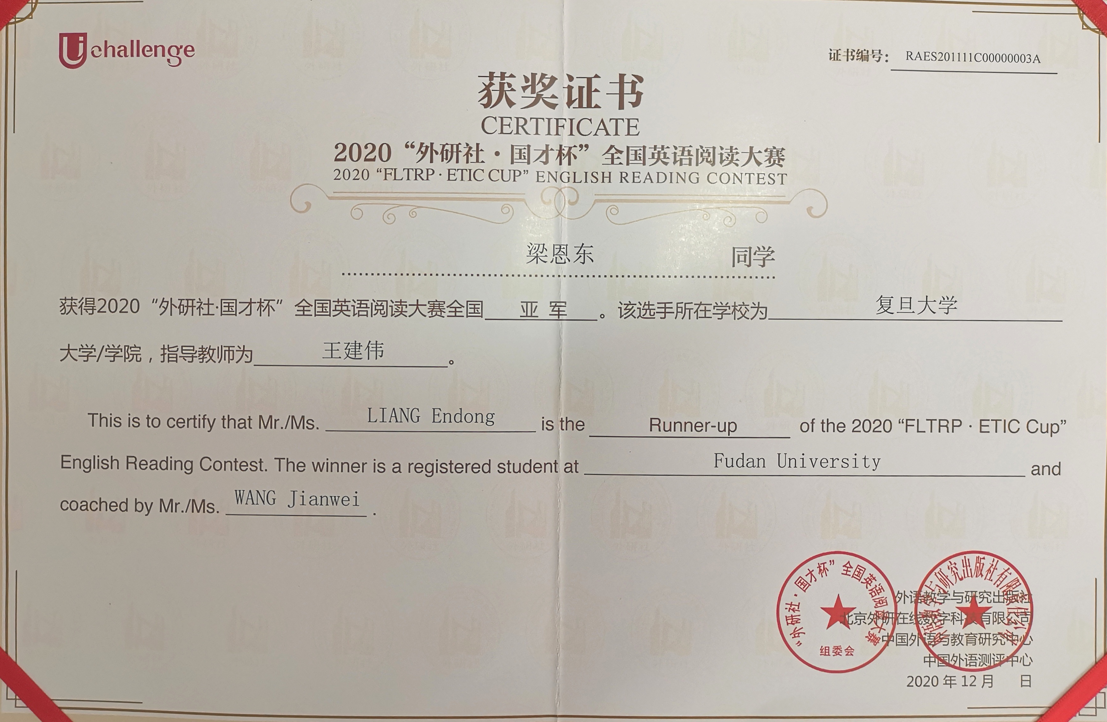 2020年12月20日,一年一度的“外研社•国才杯”大学生英语挑战赛在北京落下帷幕,我校多位选手从全国52万参赛者中斩获全国亚军、季军等佳绩。“外研社•国才杯”大学生英语挑战赛是中国高等教育学会“中国高校创新人才培养暨学科竞赛评估”中唯一入评的外语类学科竞赛,在参赛团队的合作努力下,今年复旦大学选手在本届“外研社•国才杯”外语学科竞赛中取得了多项突破。