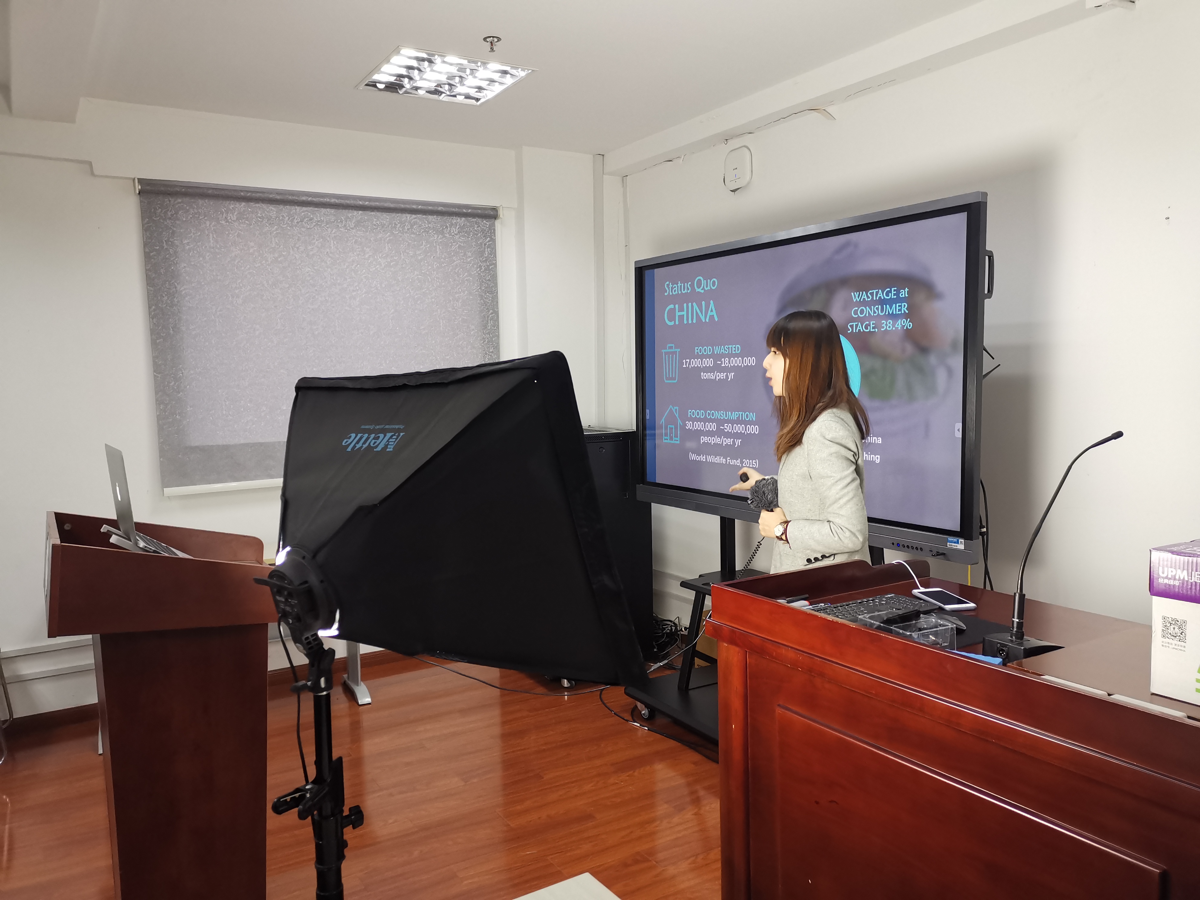 (杨康绮在参赛中) (左起:指导老师时丽娜、杨康绮、主持人傅之君)