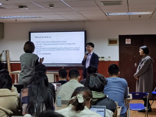 蔡若晨首先分享了个人学习工作经历,提到自己在明德大学蒙特雷国际研究学院的食堂和图书馆刻苦练习,在麦肯锡公司作为全职译员走遍祖国大江南北。强调自己从事翻译教学工作的动力是服务社会、改变社会的成就感。他在外文学院读本科时就种下了这颗种子。2008年汶川大地震时他和同学自发在相辉堂举办赈灾晚会,这样的经历让他明白社会贡献的重要价值,并最终促使他选择从事翻译教学工作。这个新角色既让人感到兴奋又挑战重重。明德大学蒙特雷国际研究学院重视学生评价反馈,要求教师不断自我打磨,精益求精,为学生提供最好的学习体验。