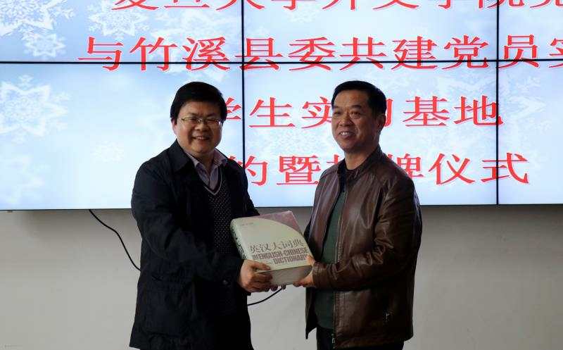 2018年4月13日上午,复旦大学外文学院党委与竹溪县委共建党员实践基地、学生实习基地签约暨揭牌仪式在竹溪县第一中学明德楼举行。外文学院党委副书记赵昕,竹溪县委常委、组织部长胡贤德,副县长杨巧燕等出席签约揭牌仪式。仪式上,双方签署协议、为基地揭牌,外文学院和县一中还互赠了纪念品。