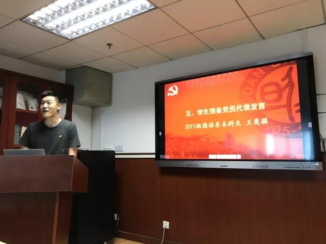预备党员代表、2015级本科生 王奕骐 同学发言,他分享了自己加入党组织之后的成长和收获,他表示,在今后的学习和生活中,决心继续践行党员的责任和义务,实现和创造自我价值。