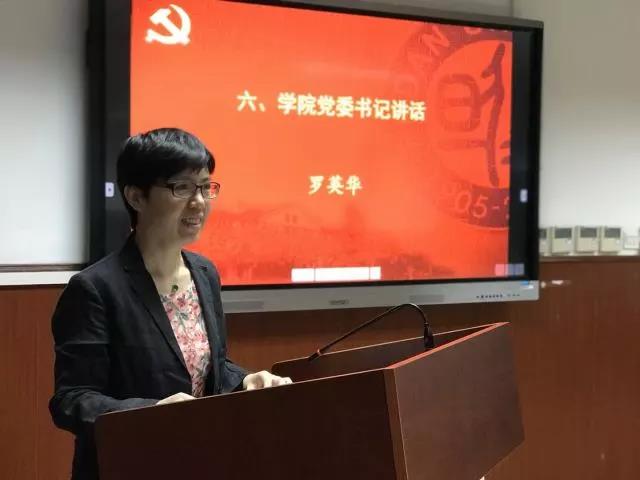 最后,学院党委书记 罗英华 为全体师生党员上党课。她介绍了入党宣誓仪式的背景和意义,并表示,时值建党97周年之际,通过回顾建党历程,重温入党誓词,要求每一位党员要做到不忘初心,牢记党对自己的要求,牢固树立并不断增强党员意识。她从一大会址和南湖红船的意义与地位谈起,结合“红船精神”即建党精神,回顾中国共产党97年的发展历程,重点阐述了共产党的初心和使命是“为中国人民谋幸福,为中华民族谋复兴”。在新时代,党仍面临着诸多考验、风险和挑战,更需要全体党员不忘初心,牢记使命,坚定信念,百折不挠。她传达了焦扬书记给毕业生上的思政课精神,勉励毕业生党员传承和发扬复旦人追求真理、家国天下、开放自由和自强不息的基因,不忘中国共产党人的初心、复旦大学的初心以及青年人的初心,带着自信拥抱新时代,带着理性认识新时代,带着责任建设新时代。她指出“共产党员”和“复旦人”是我们共同的身份,不忘初心、牢记使命,就要在思想上、行动上彰显“党员印记”,号召全体师生党员坚定信仰,努力践行,牢记自己第一身份是党员,把党章立于心中,立足岗位做贡献。学生党员要做“爱国、励志、求真、力行”的模范;教师党员要带头强化“两个所有”的意识,在师德建设中发挥先锋模范作用。她勉励党员特别是毕业生党员传承复旦基因,彰显“复旦印记”,用行动体现复旦精神,用业绩体现复旦气质。以青春之我,奋斗之我,为民族复兴铺路架桥,为祖国建设添砖加瓦。