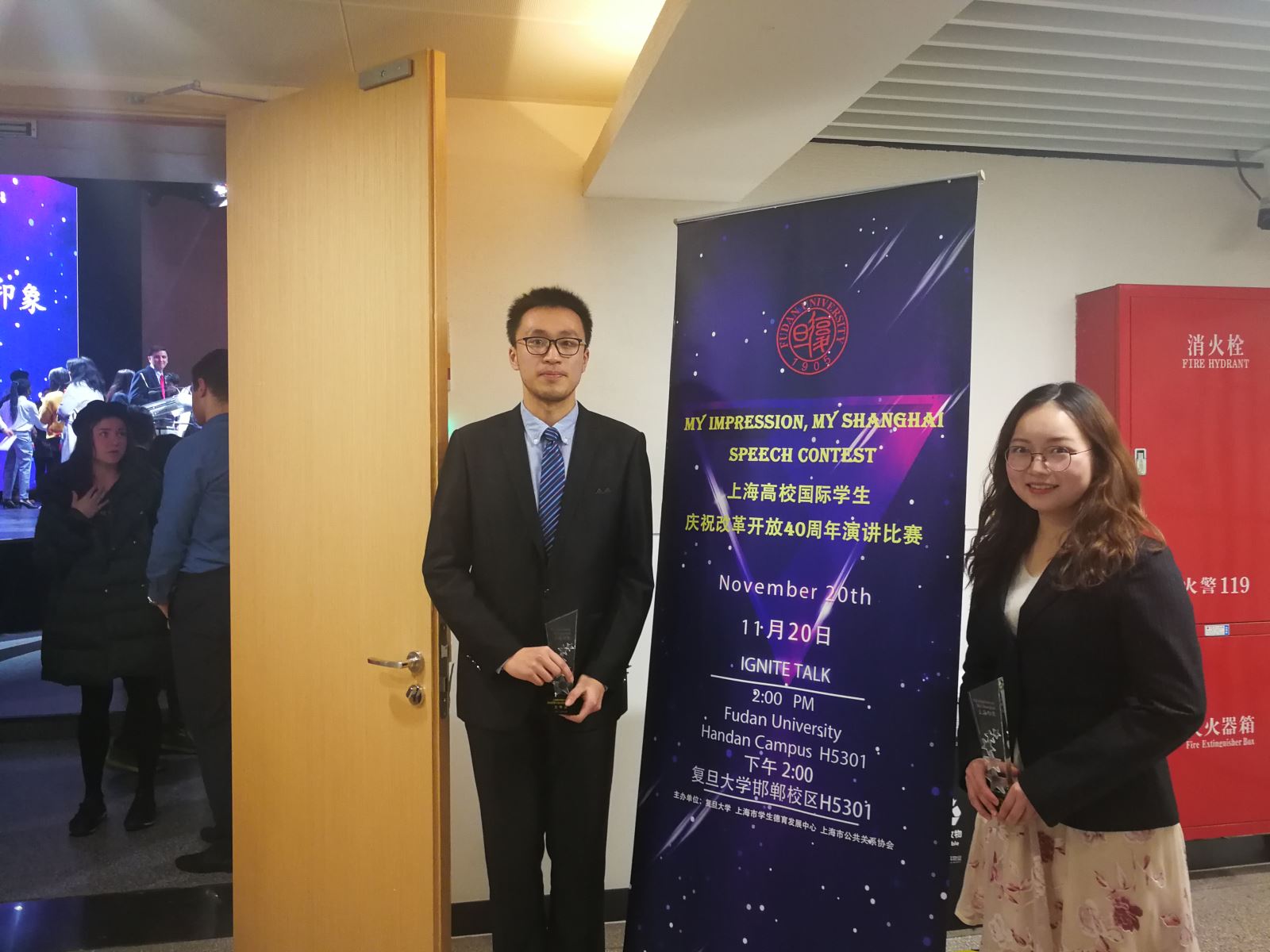 11月20日,“My Impression, My Shanghai 上海印象”上海高校国际学生庆祝改革开放40周年演讲比赛在复旦大学举行。来自外文学院的黄迎佳(英语系一年级)和熊志远(翻译系四年级)呈现了精彩的演讲,分获二等奖与三等奖的佳绩。