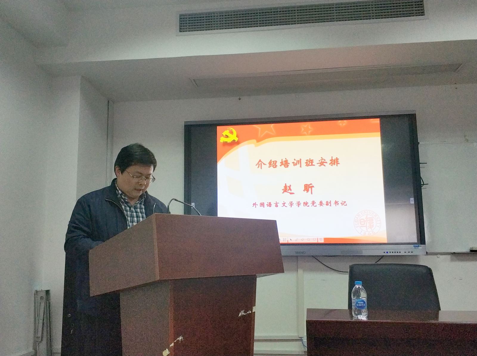 首先,外文学院党委副书记、学生党总支书记 赵昕做开班动员,并介绍培训班的培养方案、日程安排与学习要求。他从为什么要培训、什么是培训和如何开展培训三个方面进行了动员。他指出,重视学习是中国共产党推动事业发展的成功经验,新时期全面从严治党的必然要求和适应新时代发展要求的必由之路。他要求,学员们把政治合格放在首位,培养自身的社会责任,认真参加学习活动,做到真学、真信、真懂、真用,打下坚实基础,并在学习中真正有所思、有所得、有所悟。