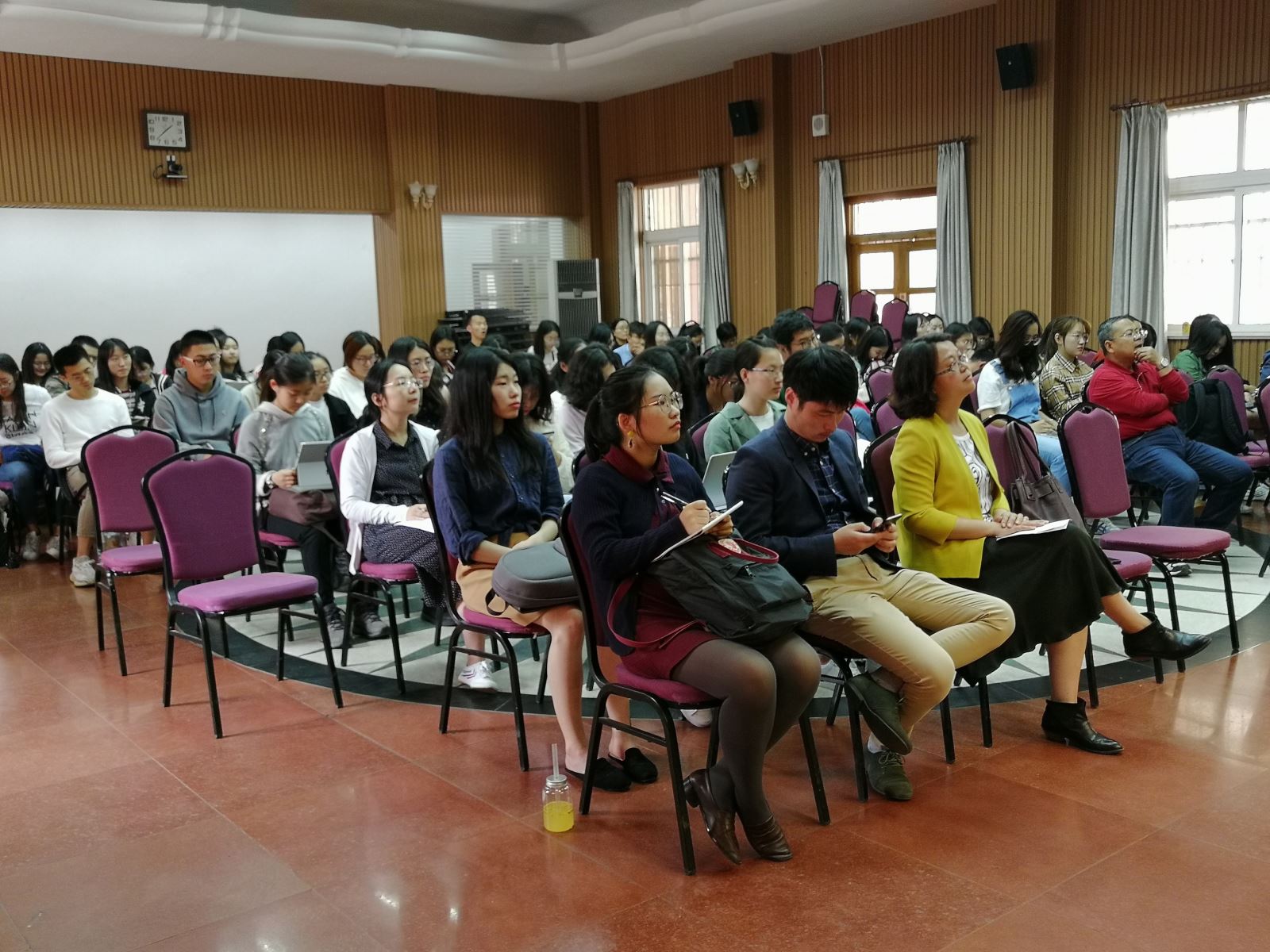 5月14日下午,外文学院分党委于工会礼堂举行第三期优秀校友讲坛暨第三期入党积极分子培训班、第二期党支部书记(骨干)培训班专题讲座。1977级法文系校友姚国强先生重返校园,为外文学院师生作了题为《4年大学与40年精彩人生——探讨外语的可能性》的精彩讲座。讲座由法文系系主任袁莉主持,近百名师生参加讲座。