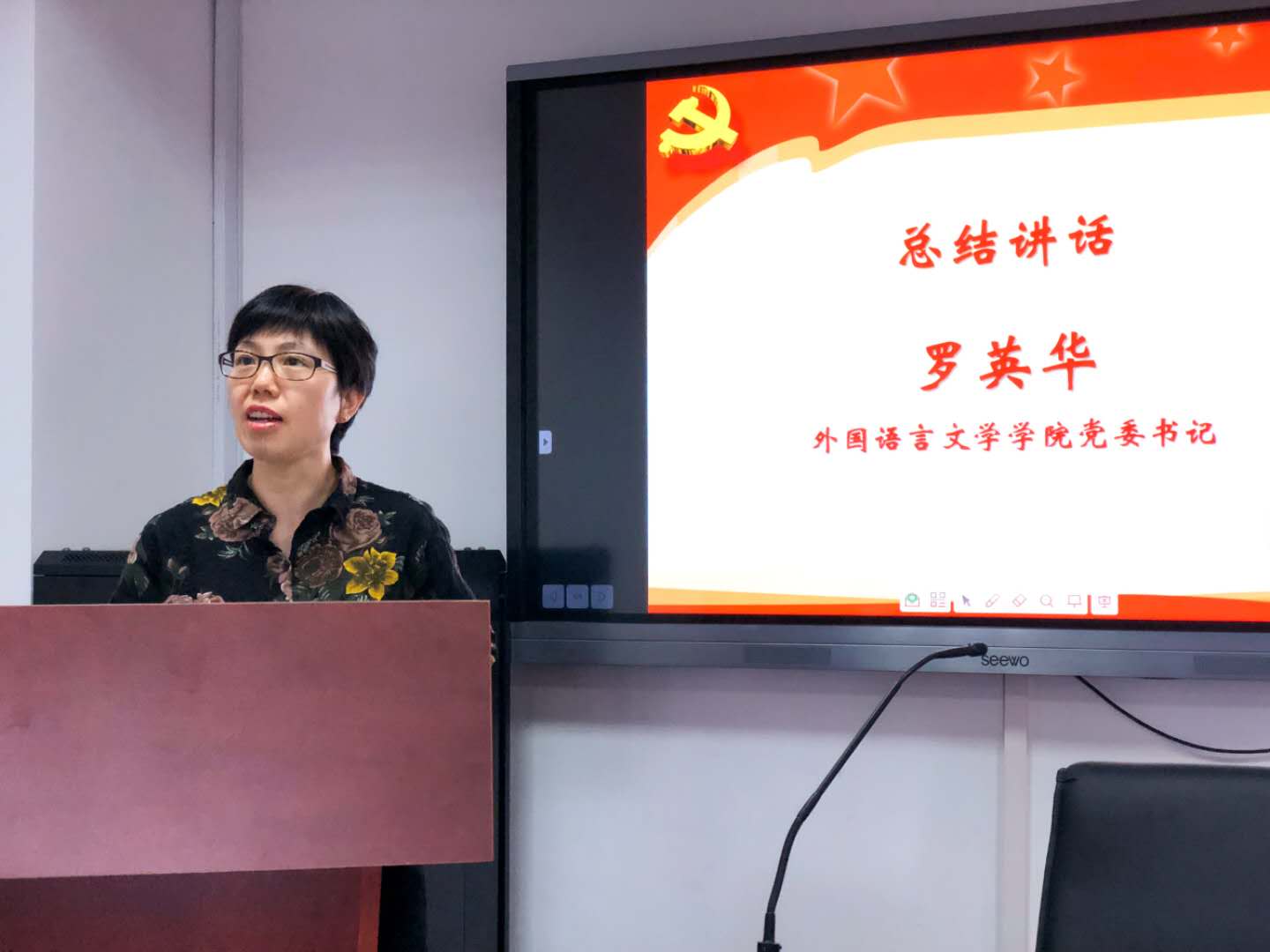 分党委书记罗英华做总结讲话。她通过分享老战士张富清和钟扬教授两位优秀党员代表的先进事迹,勉励大家居安思危,不忘初心,牢记使命。她指出,培训班的结业并不是学习的结束,入党积极分子要进一步思考自己的入党动机是否端正,党支部书记和支部骨干要思考工作和学习中是否一直在践行自己的初心;她对大家提出三点希望:一是要继续加强学习,坚定理想信念,坚持以习近平新时代中国特色社会主义思想武装头脑;二是要以高标准严要求,寻找自身差距,锤炼品格,磨炼意志;三是要脚踏实地,不断努力奋斗,入党积极分子要勇于承担起时代责任,教师党员骨干积极投身学校的双一流建设,坚持立德树人,发挥党员先锋模范作用,为实现“两个一百年”奋斗目标、实现中华民族伟大复兴的中国梦贡献自己的力量。