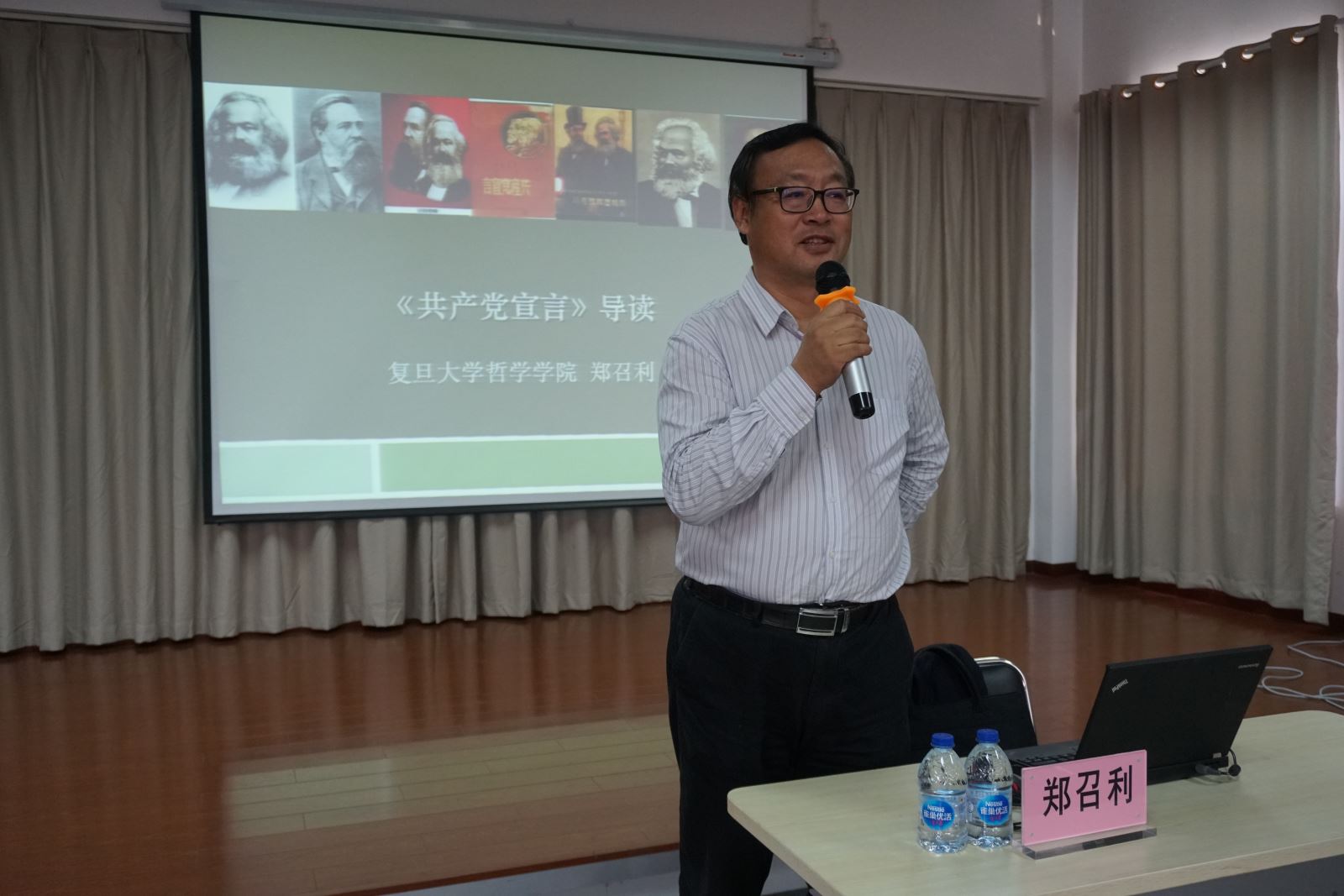 讲座开始,郑教授从陈望道老校长与周恩来总理的故事引入主题,通过一系列数据、评价与故事介绍了《共产党宣言》的广泛传播与巨大影响。
