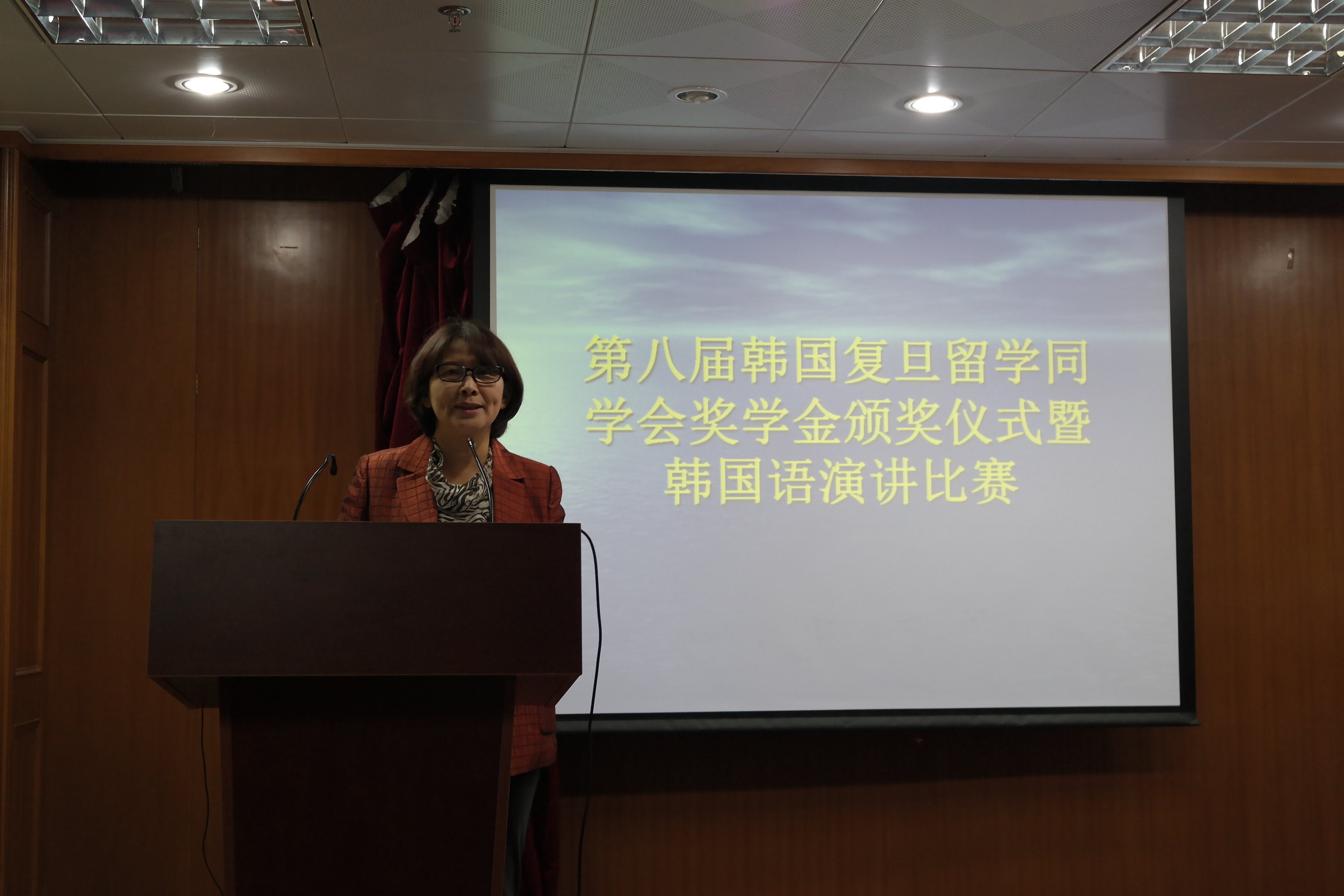 颁奖仪式和演讲比赛由系主任黄贤玉主持,气氛欢快热烈,有效激发了学生的学习动力和热情。 2015年11月13日,韩国语系全体师生在文科楼209室举行了“第八届韩国复旦留学同学会奖学金颁奖仪式暨锦湖韩亚杯韩国语演讲比赛校内选拔赛”。12级学生周子瑜,14级学生朱逸丹以及15级学生鲁佳妮、吕艾雨共4名学生分别获得奖学金1000元。颁奖仪式后举行了韩国语演讲比赛校内选拔赛。9名参赛学生经过激烈精彩的角逐,最后二年级张云睿、三年级余乐涵和四年级施一宽入选,将代表我校参加11月20日举行的“锦湖韩亚杯中国大学生韩国语演讲比赛上海地区预选赛”。