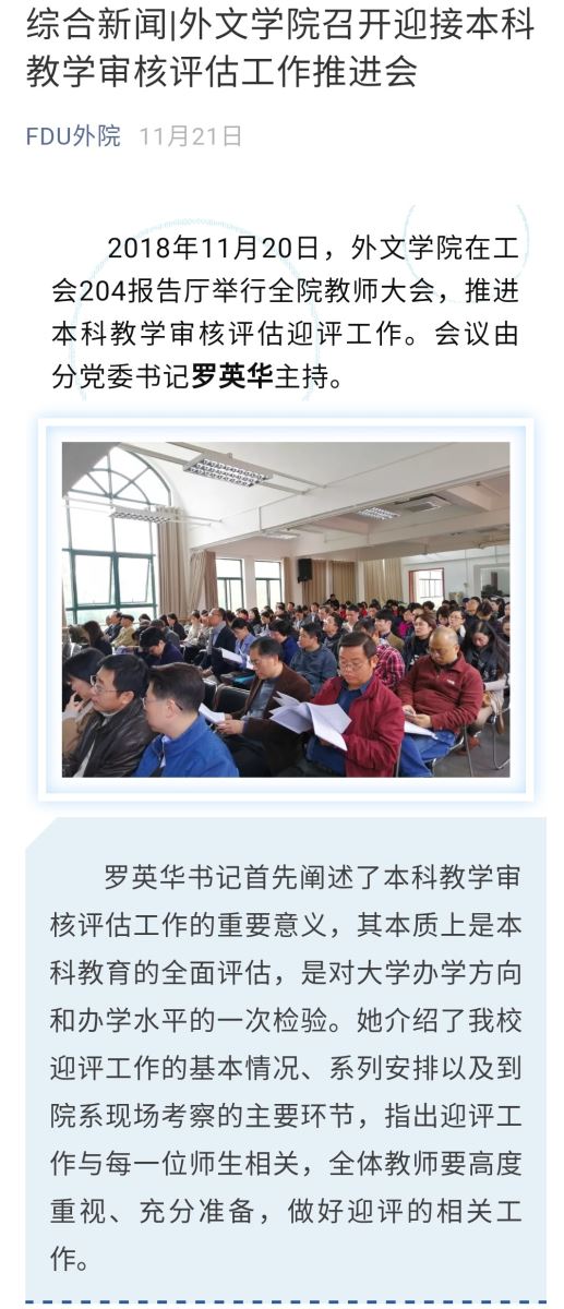 在学校的统一部署下,外文学院坚持“以评促建、以评促改、以评促管、评建结合、重在建设”,全院动员、齐心协力、认真准备、积极迎评,学院本科人才培养工作得到评估专家的肯定与好评。