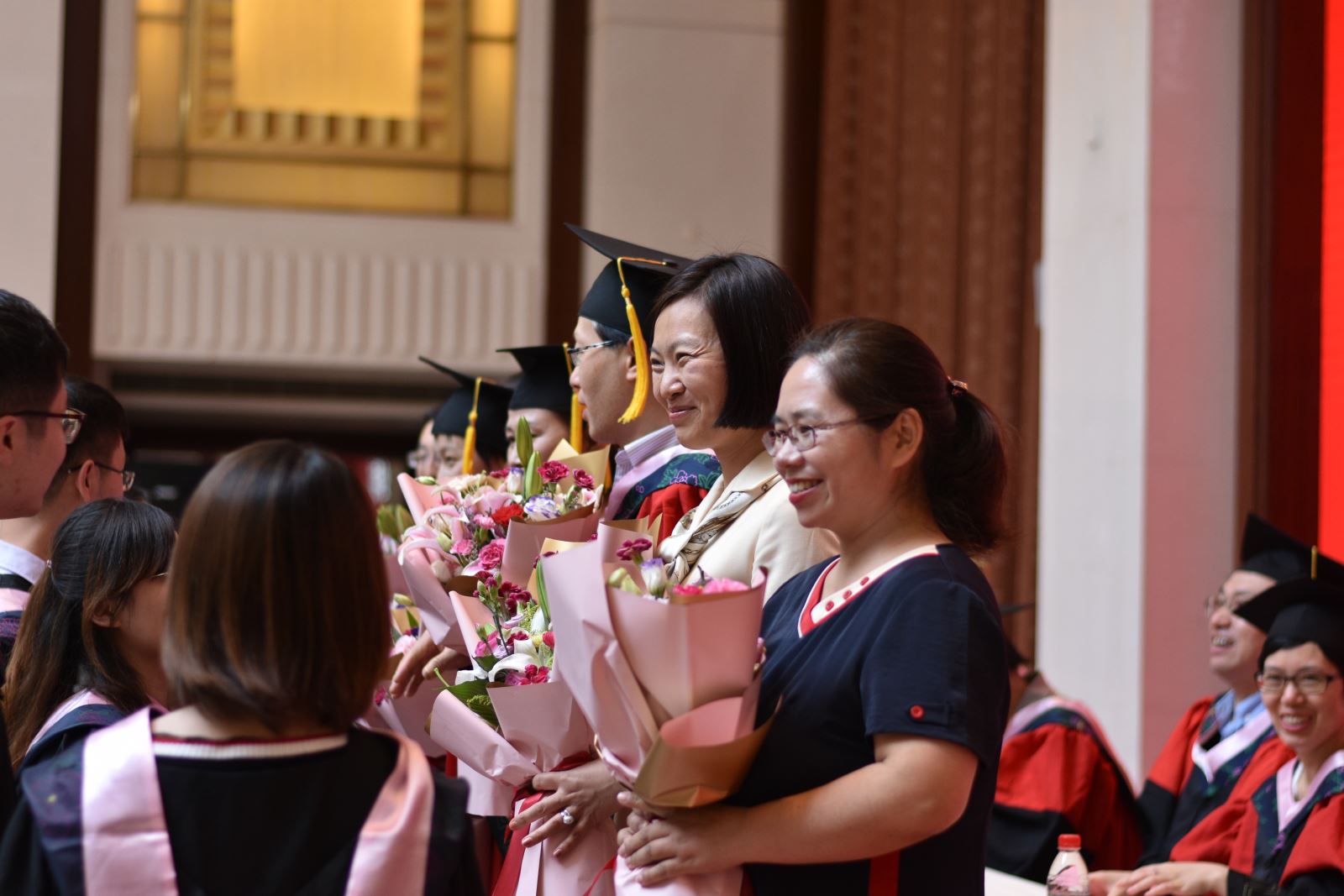 副院长卢丽安老师宣读学院2019年外文学院本科生“我心目中的好老师”名单。毕业生代表上台献花,表达对师恩的感谢。