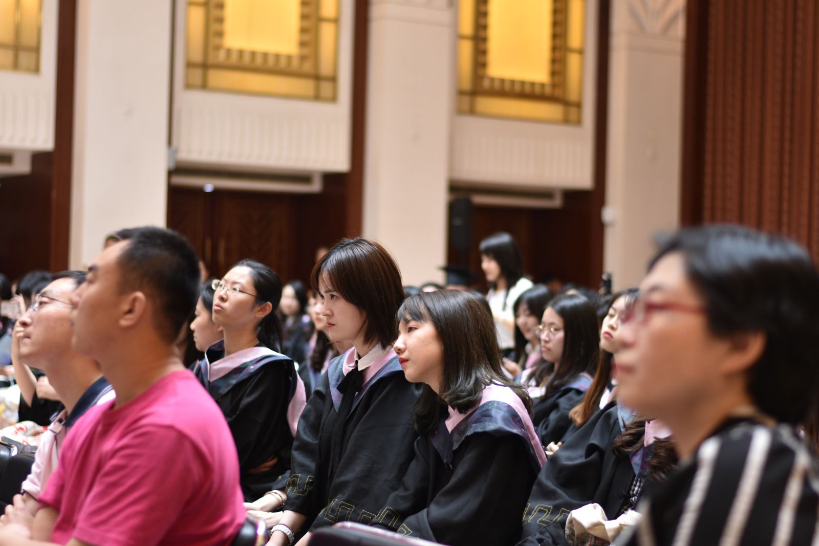 优秀本科毕业生代表、2019届英文系本科生喻子滢,优秀研究生毕业生代表、2019届日文系博士研究生朱田云先后发言,回顾了在复旦的点点滴滴,表达了对青春岁月的不舍、对学院和师长的感恩和对美好未来的憧憬。